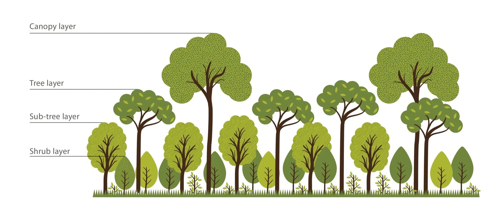 In agroforestry, we think in layers, just like a natural forest. This "stacking" maximizes productivity in a small space. The classic seven-layer system includes: